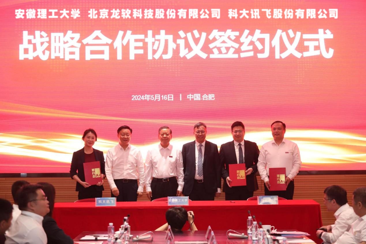 安徽理工大學(xué)科研部負(fù)責(zé)人劉輝,龍軟科技董事、副總經(jīng)理高志譽(yù),科大訊飛副總裁、安徽大區(qū)總經(jīng)理李紅明分別代表三方簽約。中國(guó)工程院院士、安徽理工大學(xué)黨委副書記、校長(zhǎng)袁亮,北京大學(xué)教授、龍軟科技董事長(zhǎng)毛善君,科大訊飛董事長(zhǎng)劉慶峰等出席并見(jiàn)證簽約。