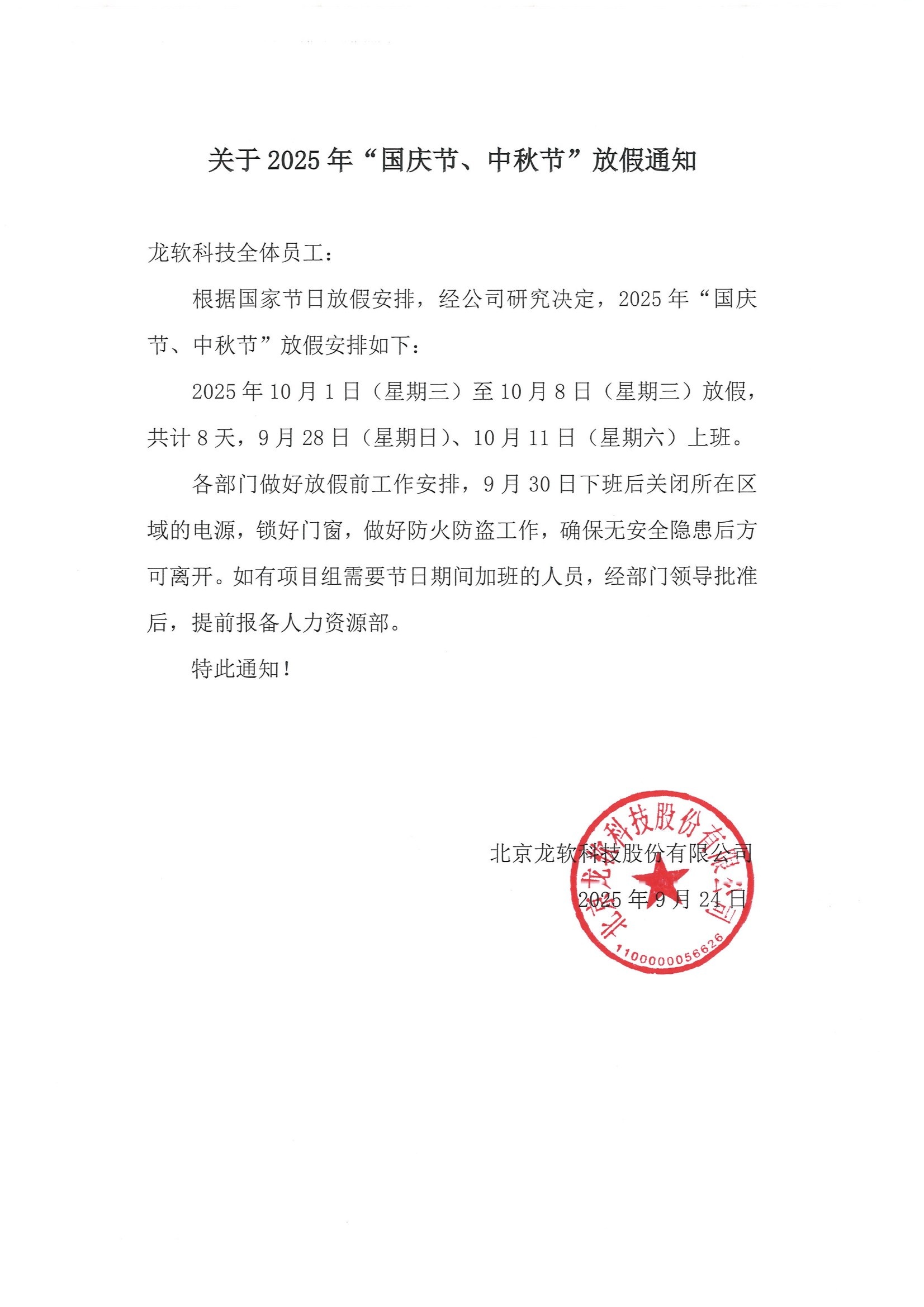 關于2025年“國慶節、中秋節”放假通知